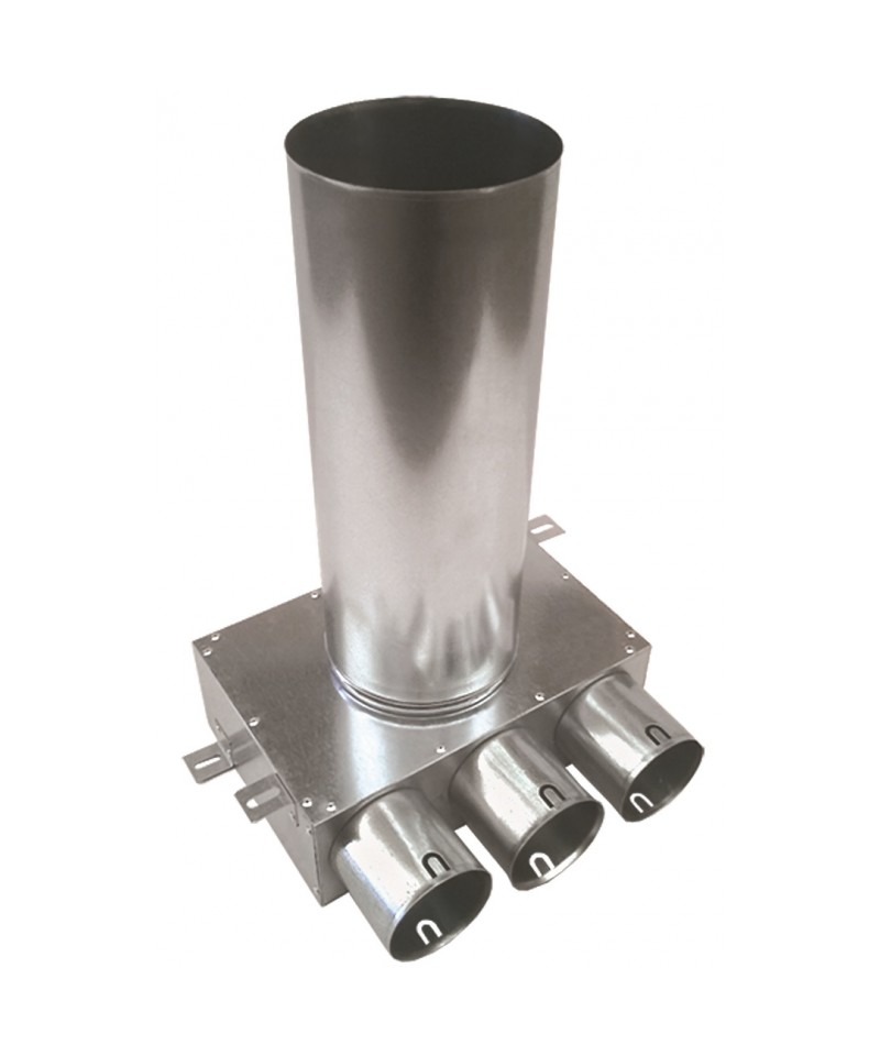 Distribučný box s kruhovým telom z pozinkovanej ocele s 3 vývodmi a prívodom vzduchu na osadenie výustky v miestnosti.