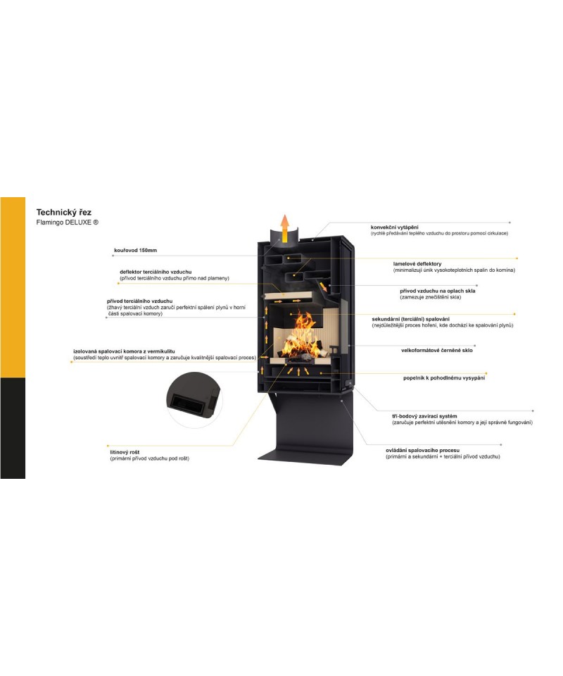Systém spalování u kamen Flamingo DELUXE je dokonalost sama. Přísun vzduchu je zajištěn centrálně ze zadní části kamen. Množství popela je minimální. Celý spalovací proces je ovládán dvěma táhly, kdy první slouží k regulaci primárního vzduchu, potřebného k zatopení a rozhoření dřeva. Druhé táhlo slouží k podpořesekundárního spalování, tedy spalování plynů. Jeho otevřením dochází k přísunu terciálního předehřátého vzduchu do horní části, který je vháněn do komory pomocí vrchního deflektoru. Tento vzduch se používá k úspornému a co nejefektivnějšímu průběhu hoření dřeva. Tímto je zajištěna vysoká účinnost a krásné hořenívčetně čistého skla. K zajištění správného spalování je zapotřebí správný tah komína, který docílíte umístěním regulátoru.
