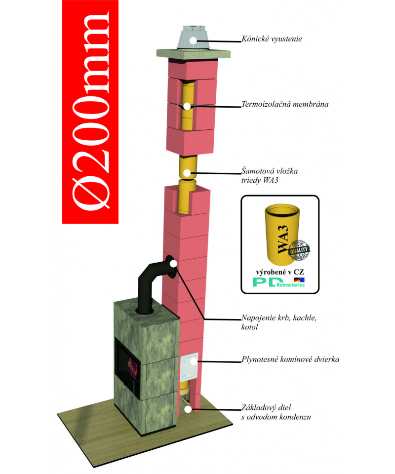 • Na tento komín môžete pripojiť každý druh kotla na tuhé palivá (uhlie, drevo, ekohrášok, brikety, rašeliny) tekuté (vykurovací olej, petrolej) ako aj plynné palivá (zemný plyn, propán, bután).