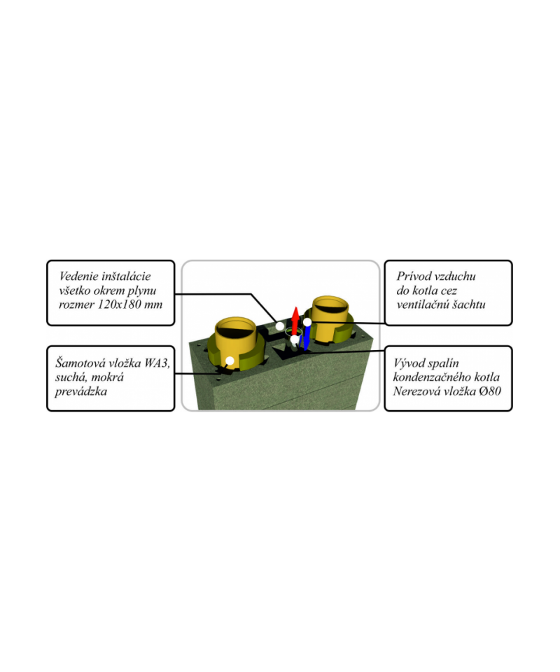 • Na tento komín môžete pripojiť každý druh kotla na tuhé palivá (uhlie, drevo, ekohrášok, brikety, rašelín) tekuté (vykurovací olej, petrolej) ako aj plynné palivá (zemný plyn, propán, bután).
