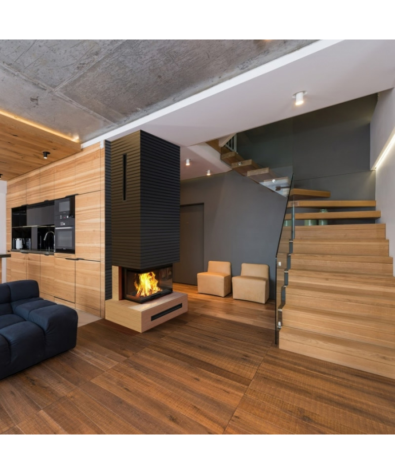 Trojstranné presklenie zaručuje maximálny pôžitok z pohľadu na oheň. dekoratívne sklo typu GLASS, ktoré opticky zväčšuje ohnisko a príjemný, tichý mechanizmus otvárania dverí.