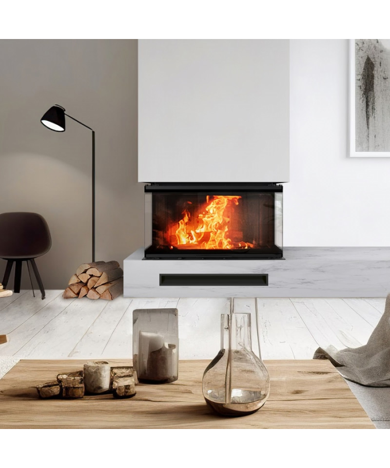 Trojstranné presklenie zaručuje maximálny pôžitok z pohľadu na oheň. dekoratívne sklo typu GLASS, ktoré opticky zväčšuje ohnisko a príjemný, tichý mechanizmus otvárania dverí.