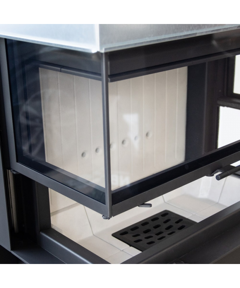 Dvojitý systém otvárania dverí - Lift up (mechanizmus gilotíny) a do strán - vľavo aj vpravo - umožňuje jednoduché nakladanie dreva a pohodlné čistenie skla, vďaka čomu je krb nielen estetický, ale aj mimoriadne praktický. Pri otváraní smerom nahor nezasahuje do obrysu miestnosti, ako je tomu u štandardných dverí na báze pántov a otvárania vľavo alebo vpravo. Vďaka tomuto riešeniu zaberá krb menej miesta, čo zvyšuje komfort používania a umožňuje lepšie usporiadanie interiéru.