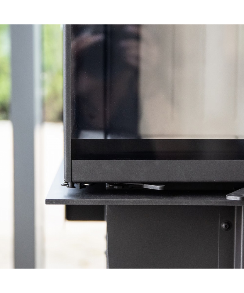 Dvojitý systém otvárania dverí - Lift up (mechanizmus gilotíny) a do strán - vľavo aj vpravo - umožňuje jednoduché nakladanie dreva a pohodlné čistenie skla, vďaka čomu je krb nielen estetický, ale aj mimoriadne praktický. Pri otváraní smerom nahor nezasahuje do obrysu miestnosti, ako je tomu u štandardných dverí na báze pántov a otvárania vľavo alebo vpravo. Vďaka tomuto riešeniu zaberá krb menej miesta, čo zvyšuje komfort používania a umožňuje lepšie usporiadanie interiéru.