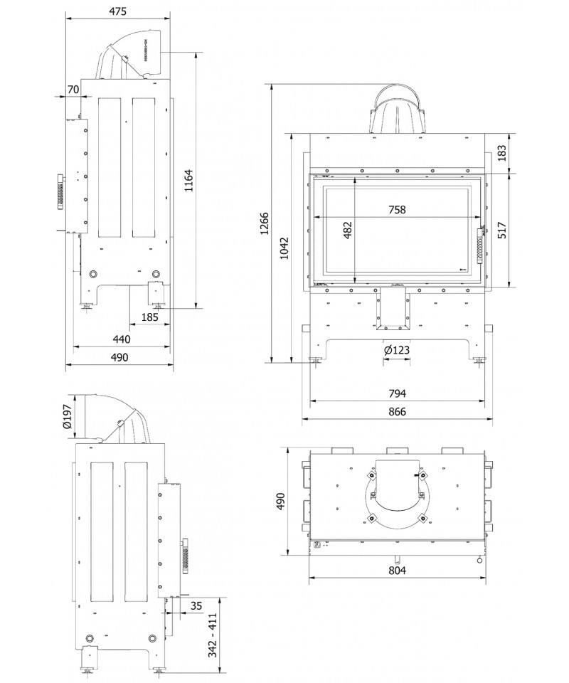 Spaľovacia komora je obložená materiálom Termotec, ktorý zabezpečuje efektívne spaľovanie, akumuluje teplo a zvyšuje teplotu v peci. Nový dizajn - drážkovaný povrch dodáva krbu eleganciu a moderný charakter.