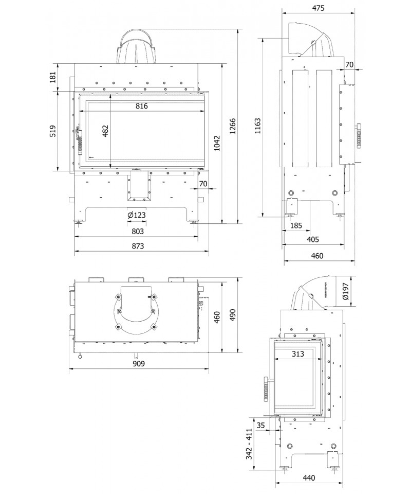 Spaľovacia komora je obložená materiálom Termotec, ktorý zabezpečuje efektívne spaľovanie, akumuluje teplo a zvyšuje teplotu v peci. Nový dizajn - drážkovaný povrch dodáva krbu eleganciu a moderný charakter.