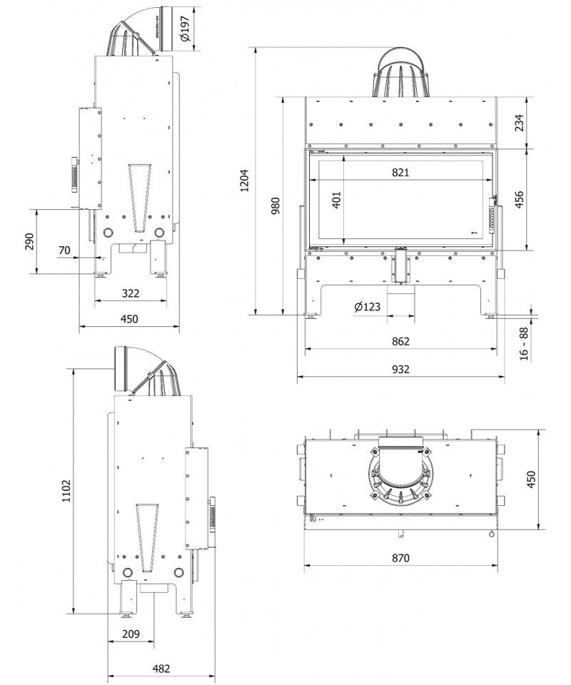 Nastaviteľné nožky - Umožňujú vyváženie krbovej vložky na nerovných podlahách.