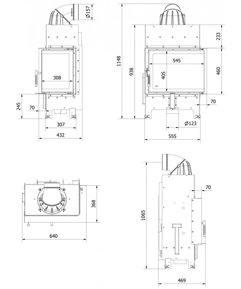Nastaviteľné nožky - Umožňujú vyváženie krbovej vložky na nerovných podlahách.