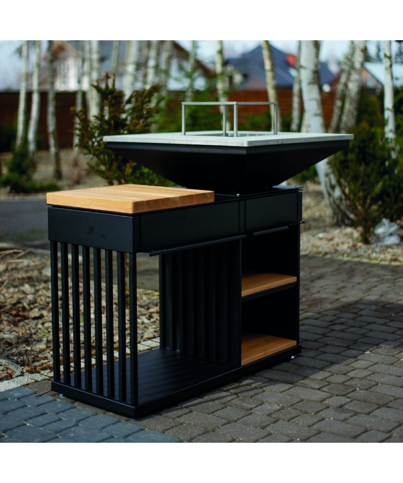 Drevená polica na záhradný gril s krbom na drevo QUADRUM.