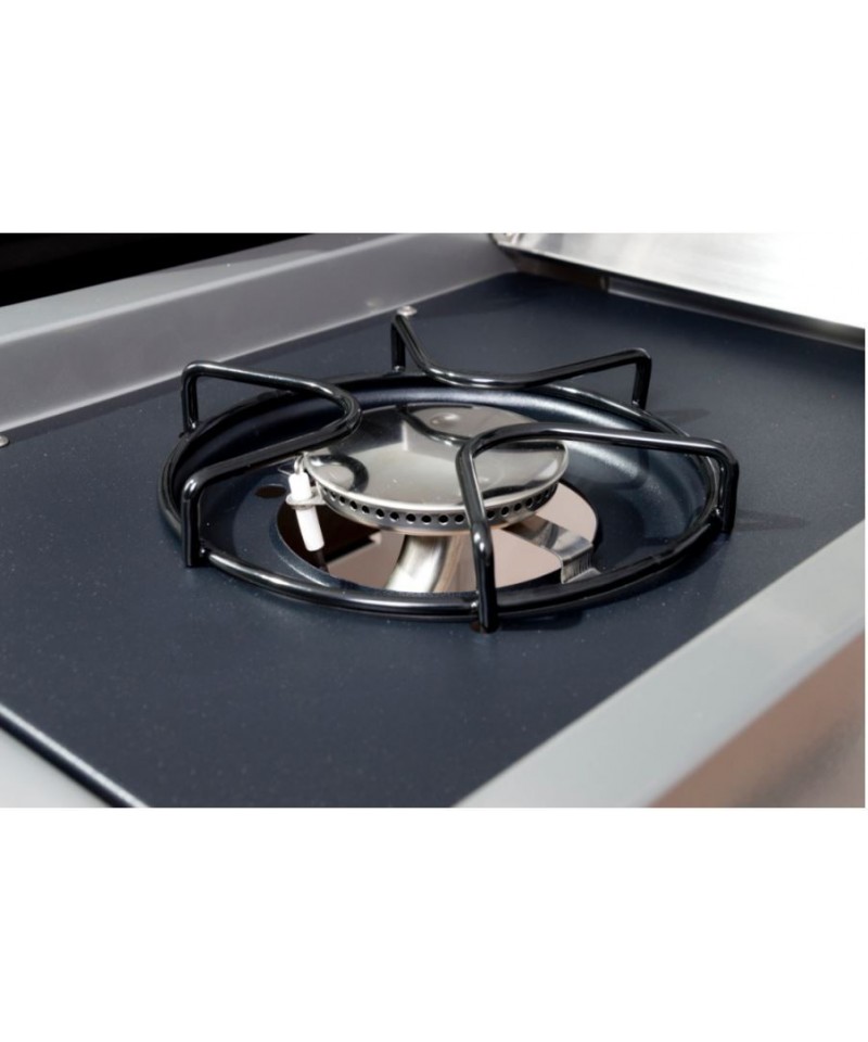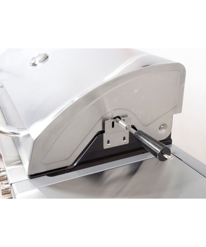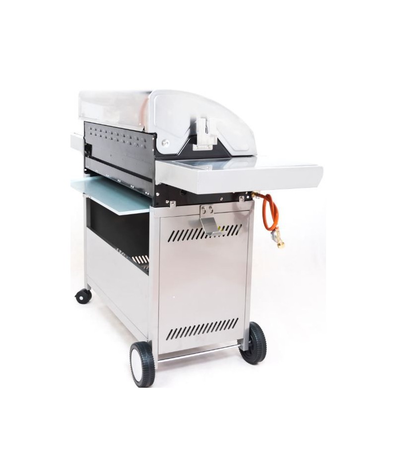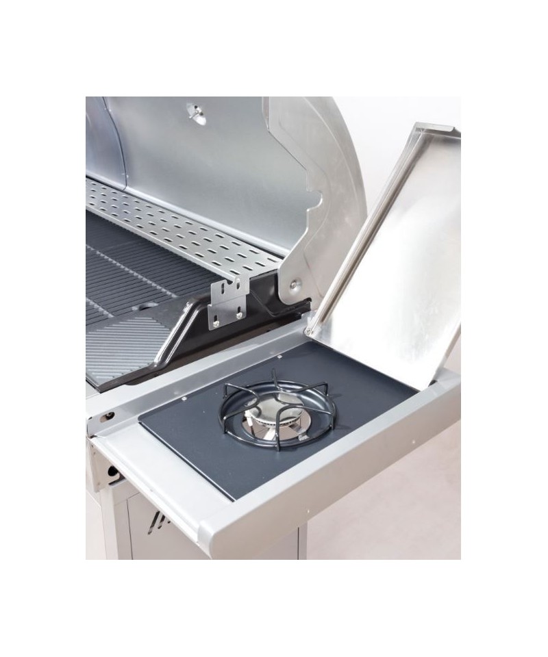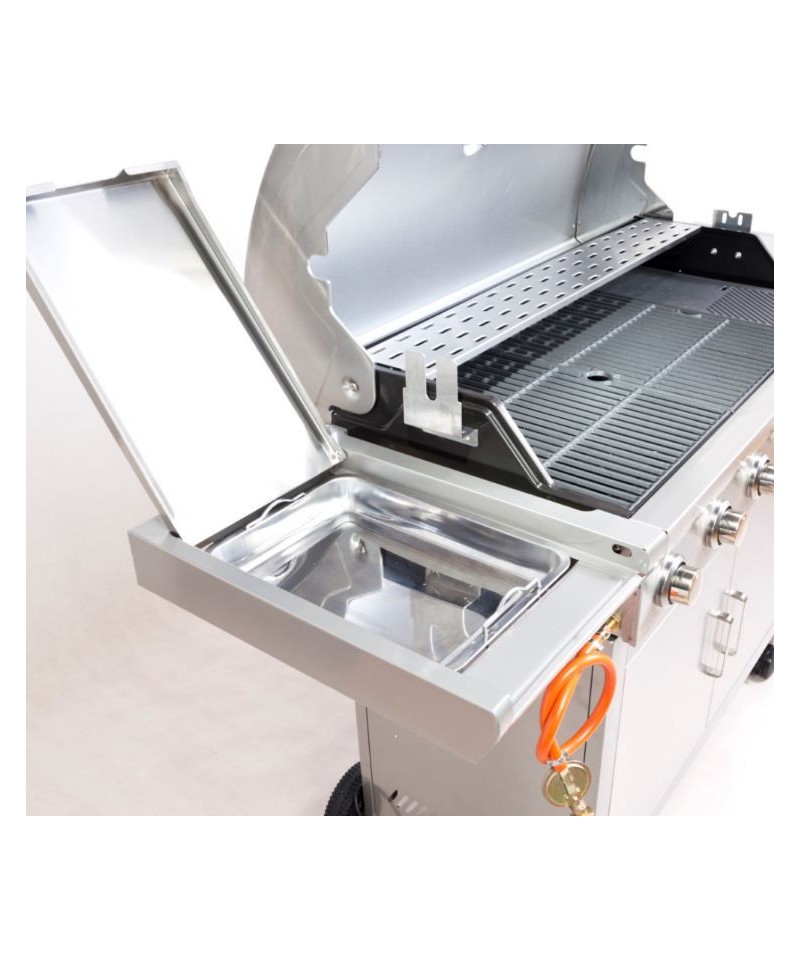 Záhradný nerezový plynový gril je opatrený odklápacím krytom grilovacej plochy a odkladacími poličkami na oboch stranách. Pod ľavú odkladacou plochou sa skrýva nádobka, kam môžete odkladať napr. Naložené mäso pripravené na grilovanie. Pod pravou odkladacou plochou sa nachádza bočné horák. Disponuje tiež liatinovú doskou a liatinovým roštom.