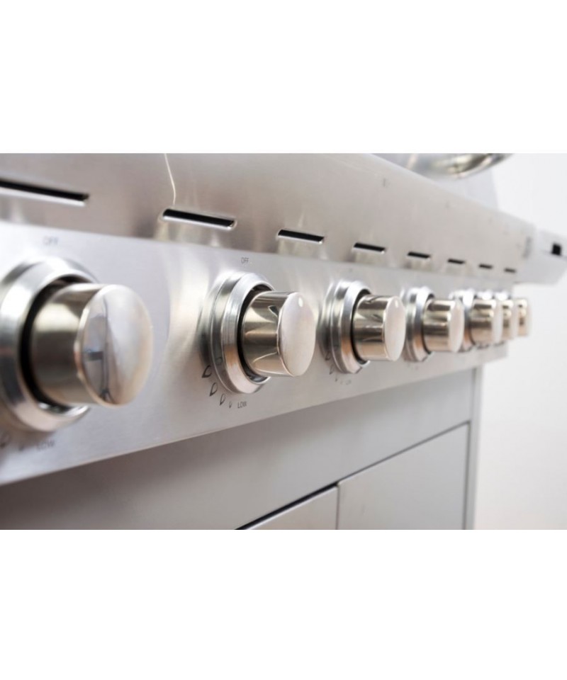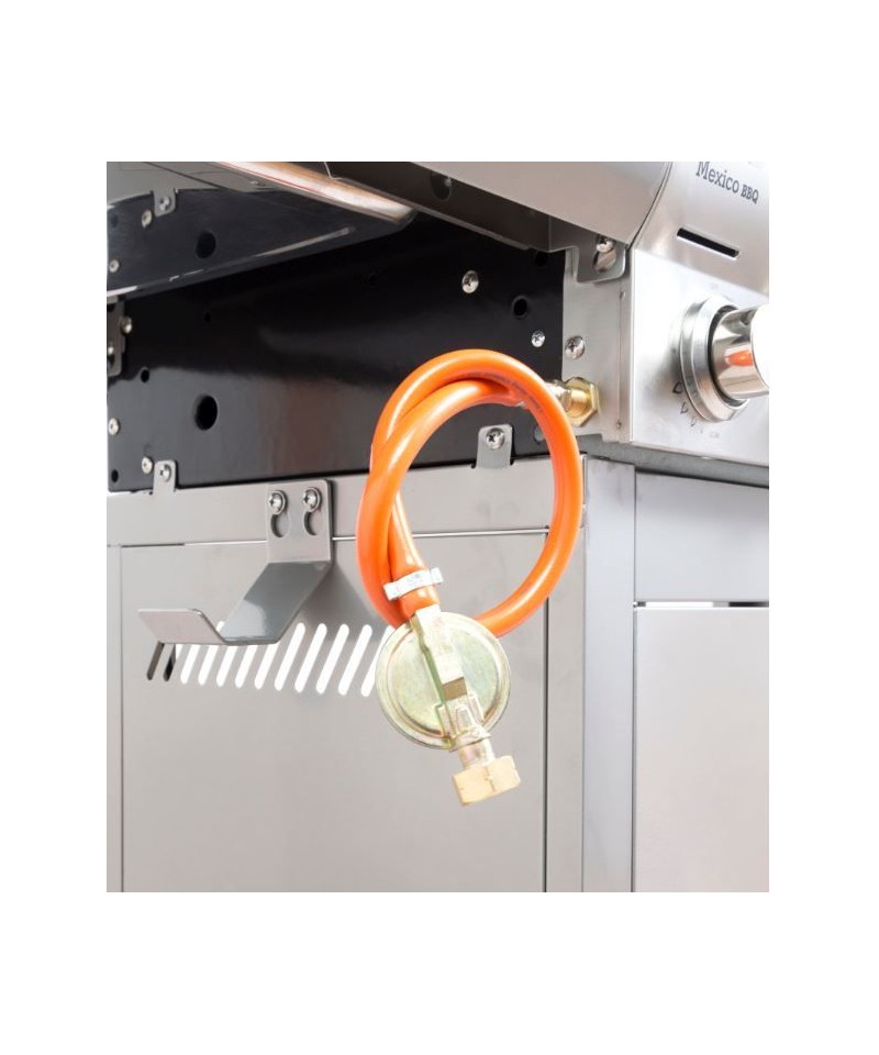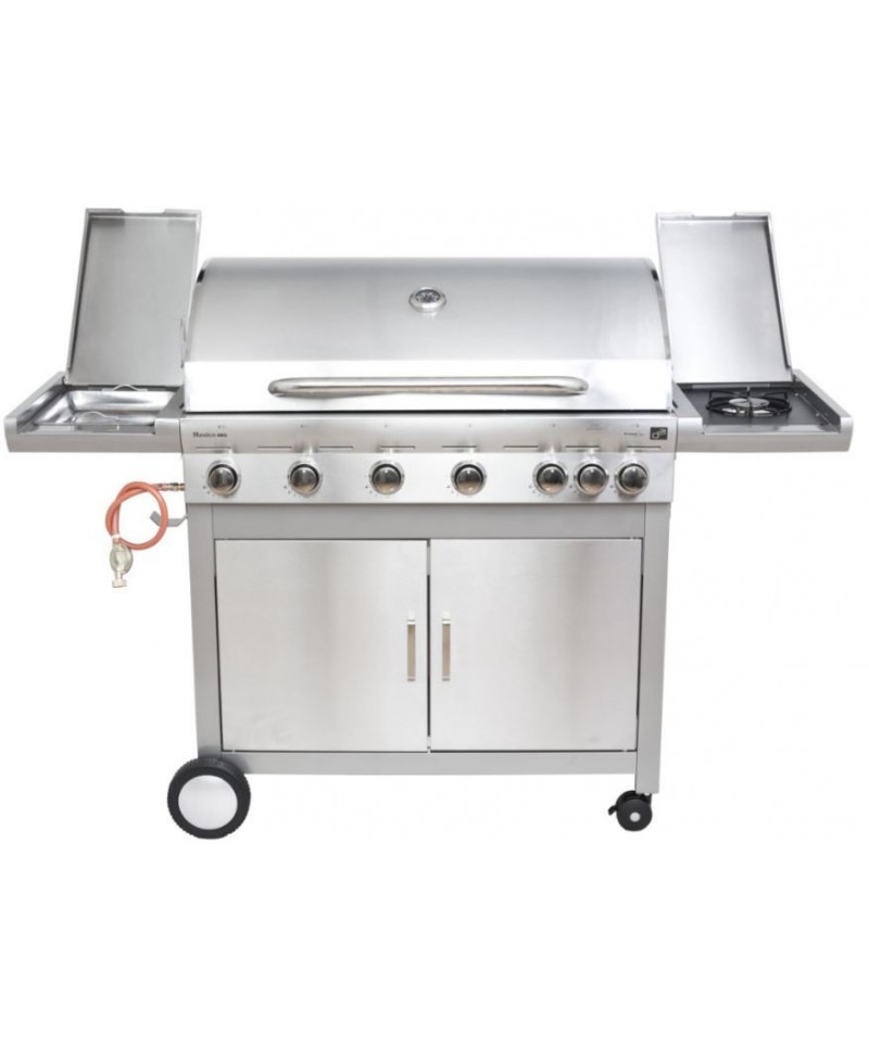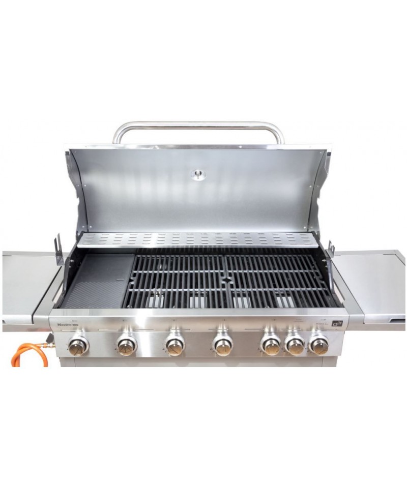 Plynový gril G21 Mexico BBQ Premium Line je vybavený systémom Flame Tamer, 6 hlavnými nerezovými horákmi + jedným bočným horákom s elektrickým zapaľovaním a plynovú reguláciou.
