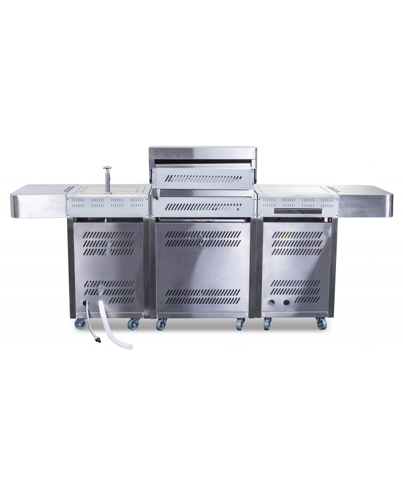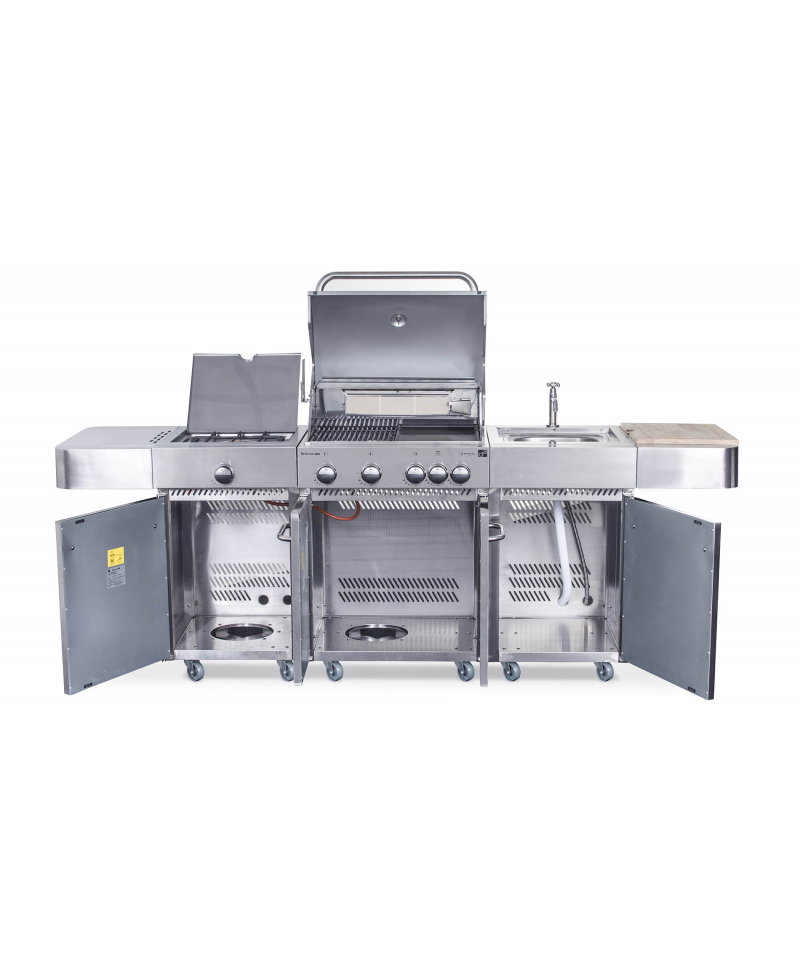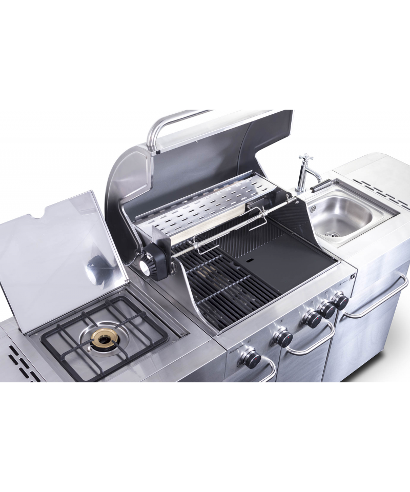 G21 BBQ Arizona nie je len obyčajný gril, ale dokonalá záhradná kuchyňa, ktoré nič nechýba. Plynové horáky so systémom Flame Tamer, drez pre pohodlné oplachovanie riadu, priestranná pracovná plocha pre prípravu pokrmov i dokonale vyriešený úložný priestor.
