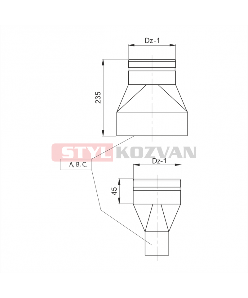 Symetrická redukcia z hranatého potrubia 150x50mm na flexi potrubie s priemerom 125 mm