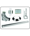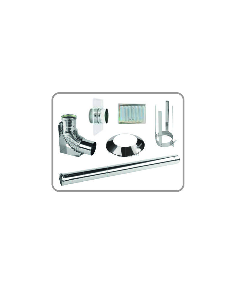 SET KONDENZ NEREZ v priemere Ø80 mm obsahuje, nerezové vložky (počet kusov podľa výšky), pätkové koleno, podperu, objímky, protidažďovú manžetu, nerezovú mriežku a pripajací diel Ø80/Ø125.