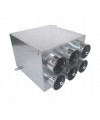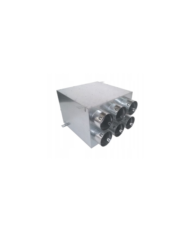Rozdeľovací box pre rekuperáciu s 6 vývodmi a 1 prívodom na pripojenie k hlavnému rozvodu vzduchu. Box slúži na rozdelenie hlavného potrubia na rozvod vzduchu pre jednotlivé miestnosti. Do vývodov sa pripoja flexibilné potrubia pre jednotlivé vetvy. Nepotrebné vývody sa zaslepia zátkou. Netesnosti sú eliminované tesnením, poprípade je možné spoj prelepiť hliníkovou páskou. Prívod vzduchu Ø 200 mm slúži na osadenie hlavného potrubia na prívod, alebo odvod vzduchu do vetracieho zariadenia. Box je z vnútornej strany vystlaný zvukovo izolačnou penou, ktorá tlmí hluk v potrubí. Počas finalizácie interiéru sú otvory proti vniknutiu nečistôt chránené už osadenými hadicami alebo záslepkami. Montáž je možná napríklad nad stropom bungalovu alebo v stropnej dutine.