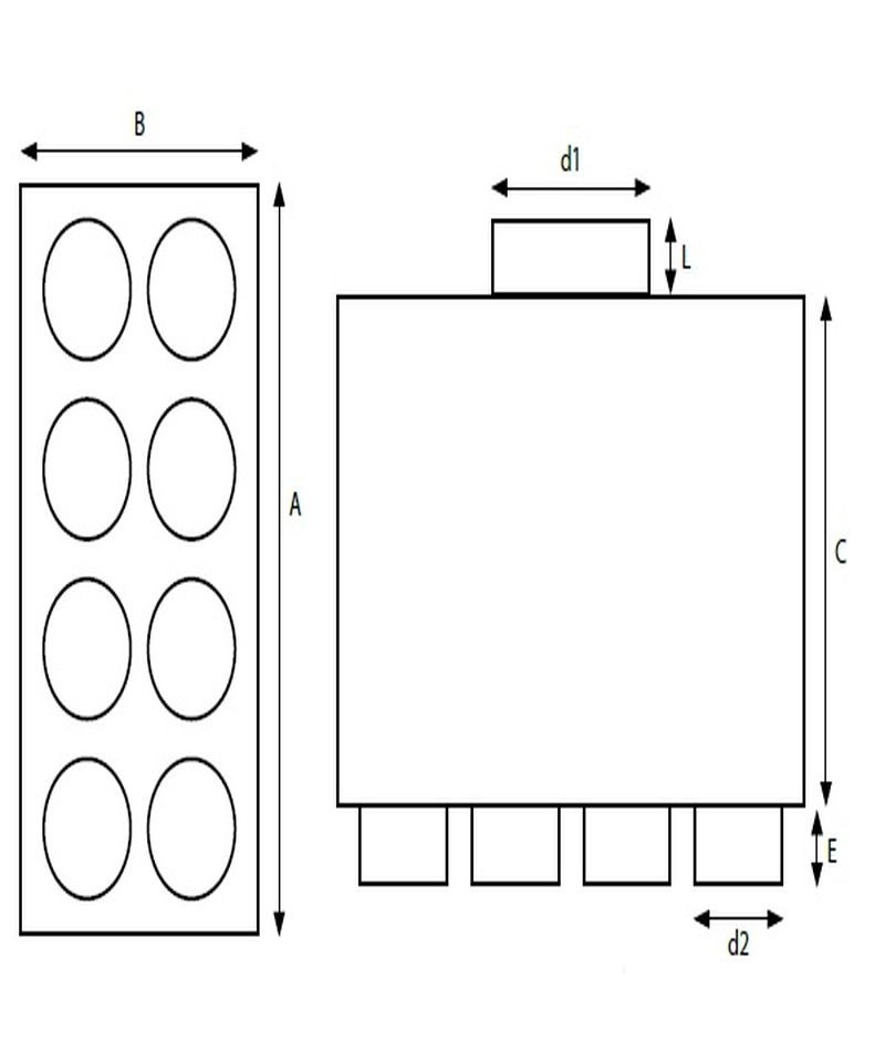 Rozdeľovací box pre rekuperáciu s 8 vývodmi a 1 prívodom na pripojenie k hlavnému rozvodu vzduchu. Box slúži na rozdelenie hlavného potrubia na rozvod vzduchu pre jednotlivé miestnosti. Do vývodov sa pripoja flexibilné potrubia pre jednotlivé vetvy. Nepotrebné vývody sa zaslepia zátkou. Netesnosti sú eliminované tesnením, poprípade je možné spoj prelepiť hliníkovou páskou. Prívod vzduchu slúži na osadenie hlavného potrubia na prívod, alebo odvod vzduchu do vetracieho zariadenia. Box je z vnútornej strany vystlaný zvukovo izolačnou penou, ktorá tlmí hluk v potrubí. Počas finalizácie interiéru sú otvory proti vniknutiu nečistôt chránené už osadenými hadicami alebo záslepkami. Montáž je možná napríklad nad stropom bungalovu alebo v stropnej dutine.
